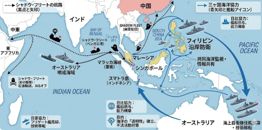 日本・オーストラリア・フィリピンの連携は、インド洋からマラッカ海峡、そして南シナ海に至るシャドウ・フリートの主要航路を「可視化」するうえで決定的な意味を持ちます。
