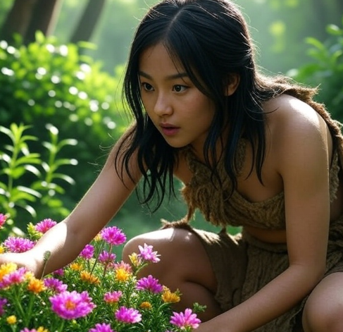 ある日、ユウキはいつものように仲間と川に漁に出ていました。その帰り道、サクヤとその友達数人が森の中で何やら楽しげに語り合っていました。よく見ると、彼女たちは小さな花を摘んでいたのです。木漏れ日の柔らかな光に包まれながら、楽しそうに花を摘んでいました。その姿は、まるで森を棲み処としている精霊のようでした。彼は息をのみました。彼女の手に摘まれた花は、彼女の笑顔と一体になって、私の心に深く刻み込まれました。このときユウキは、女性が花を愛する存在であることを初めて知ったのです。